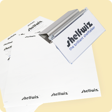Shelf talkers that fit into Shelfwiz clips can be printed on your computer’s printer using the templates on our Templates Page. Each dozen shelf clips that you order come with six perforated sheets to print on that match the size of your Shelfwiz. You can order more perforated sheets here. Ordinary paper can also be used, but you will have to cut out the shelf talkers yourself.
